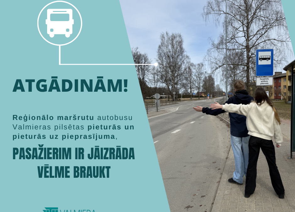 Aicinām pasažierus būt vērīgiem, izmantojot reģionālo maršrutu autobusus Valmieras pilsētas pieturās, kā arī pieturās uz pieprasījuma. Svarīgi savlaicīgi signalizēt par savu nodomu – paceliet roku, lai autobusa vadītājs jūs laikus pamanītu un varētu droši apstāties pieturā.